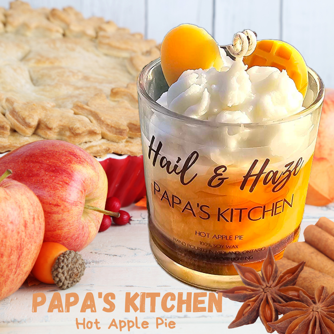 Introducing "Papa's Kitchen" – Step into the heartwarming embrace of nostalgia with our "Papa's Kitchen" candle. This inviting scent carries the comforting aroma of freshly baked hot apple pie, evoking memories of cherished moments and homemade delights. Crafted with care from premium soy wax, this candle not only radiates a warm, cozy glow but also fills your space with the irresistible fragrance of tender apples, cinnamon, and a buttery crust. Whether you're yearning for the familiar scent of family gatherings or simply seeking comfort, "Papa's Kitchen" is the perfect choice.